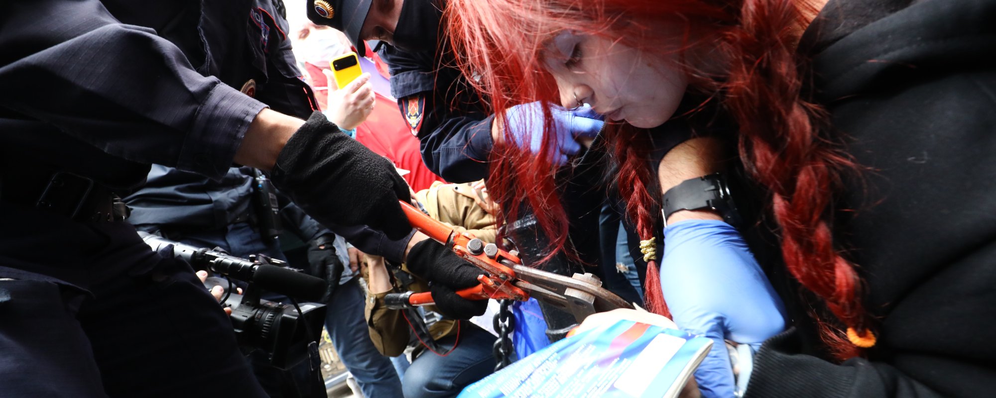 Задержанная приковала себя наручниками к столбу. Ей вменили нарушение правил самоизоляции (ст. 8.6.1 КоАП Петербурга) и отпустили.