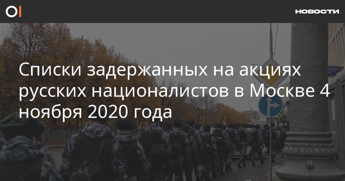4 ноября 2020 года в Москве планировался ряд акций русских националистов под эгидой традиционного «Русского марша». Ни одну из заявленных предварительно акций не удалось согласовать с местными властями. По данным на 15:30 5 ноября, всего в Москве задержали более 60 человек. Публикуем список.
