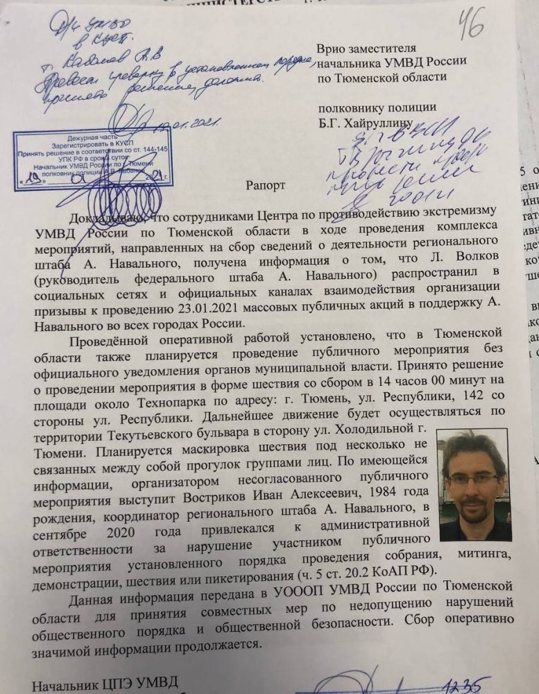 Полиция задержала координатора штаба Навального в Тюмени Ивана Вострикова. Его доставили в ОП № 5 Тюмени, как пишет «Апология протеста», «для проверки причастности к кражам».