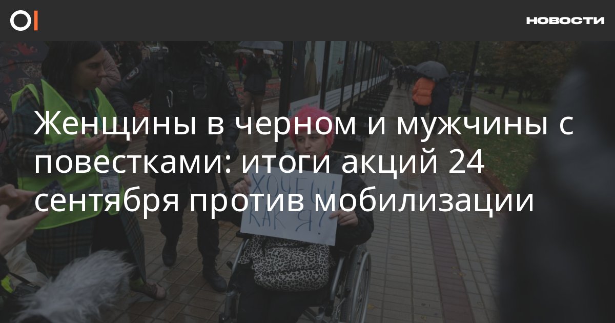 Россияне продолжают протестовать. По данным на 01:00 25 сентября задержано не менее 783 человек в 33 городах. Полицейские действуют грубо, сегодня, кроме прочего, они специально задерживали женщин в черной одежде — Феминистское антивоенное сопротивление призвало участниц выходить на акции именно в таких цветах.