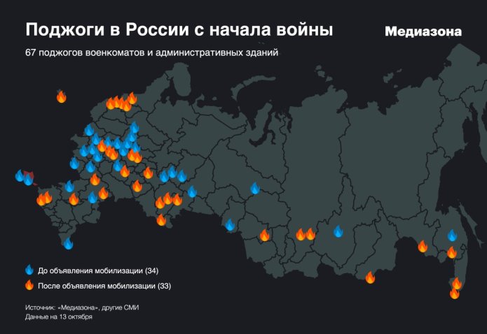 С начала полномасштабной войны в Украине в разных городах России происходят поджоги военкоматов и административных зданий. После объявления «частичной» мобилизации такие поджоги, в особенности поджоги военкоматов, участились. ОВД-Инфо предполагает, что по крайней мере часть этих действий явилась ответом на военную агрессию России.