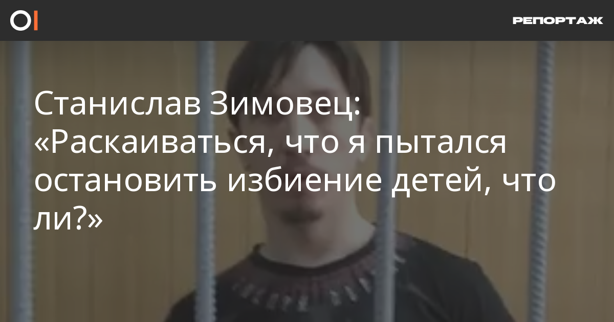 Светлана Сидоркина спросила у своего подзащитного, раскаивается ли он. «Если бы я причинил ущерб, я бы раскаялся. А то, что я бросил [фрагмент кирпича]? Раскаиваться, что я пытался остановить избиение детей, что ли? Если бы доказали, то я бы раскаялся, — ответил Зимовец. — Мне кажется, мою вину пытаются притянуть за уши. А быть в стороне я не могу. Я общественник».