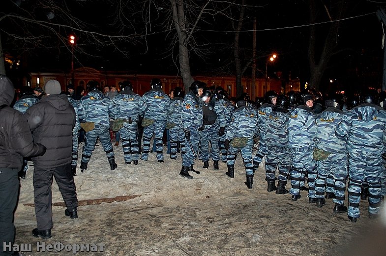 Площадь начал окружать ОМОН. Количество присутствующих значительно поуменьшилось, но пара тысяч все равно оставалась на месте. И тут началось. Сначала ОМОН играл в какую-то карусель вокруг фонтана, а потом начали вытеснять людей из сквера, оставив сидевших в фонтане в окружении. Не церемонились. Со спины чья-то рука в перчатке схватила меня за лицо и начала нащупывать рот. Сосед крикнул: «Осторожно!» Я вывернул голову, но был схвачен за… шапочку. Ага, вот такой болевой прием от полиции. Шапочка слетела, я было обернулся за ней, но получил удар в челюсть. Отвечать нельзя! Делаю несколько шагов вперед, меня пытается сбить с ног подлетевший сбоку боец. Хватает меня за одежду, срывает фотоаппарат. Фотик летит под ноги сминаемой толпе, а я сзади получаю удар электрошокером под колено. От неожиданности падаю. Повезло. По мне пробежали и я остался за спинами ОМОНовцев. Нахожу фотик. Шапочку мне подносит какой-то молодой полицейский, еще не успевший потерять совесть.