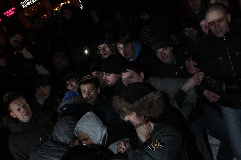 Но буду последовательным, после митинга, как и обещал, моя дорога вела на Манеж. Перед переходом с Пушки ОМОН уже брал людей в автозаки, бесцельная жертва, поэтому Я прошёл мимо. С другом (которого из-за фоток с Болотной/10.12.11 через 17 дней отчислили с пятого курса МГУПП) шли по Тверской, когда встретили на обратном пути моих друзей из ИнформПрорыва. По их словам там делать было нечего. Мы развернулись в сторону Пушки, по дороге встретили Ефимыча (Бориса Немцова) он так дальше и проследовал «окружать Кремль» вместе с небольшой группой единомышленников (как потом узнал из ОВД, ему это удалось в составе 20 человек).