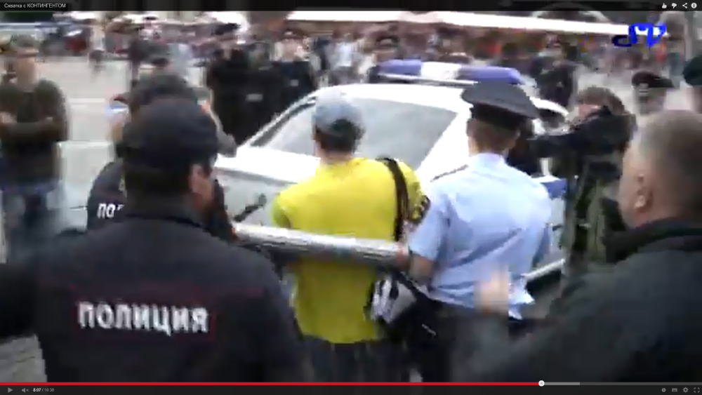 Я хотел бы подчеркнуть, что задержал меня тот же человек, который задерживал меня в субботу (24 мая). Они уже настолько обнаглели, что действуют, зная, что все записывается на видео, что они препятствуют одиночному пикету. В тот раз он сообщил сначала, что у меня на плакате было оскорбление, хотя я объяснил, что «позор» — это выражение моего мнения в соответствии со статьей Конституции, где гарантируется свобода мнения. Сейчас сослались на слова какого-то заявителя. Но внутри, в отделе, они пишут в протоколах совсем другое. В прошлый раз мне сообщили, что в пикете был якобы не один я, а нас было двое, и написали 20.2 ч.5. А сейчас, когда уже приехали туда, не сказали ни о каком заявителе, а перед тем, как меня выгнать из отдела, завели, как и в прошлый раз, двух охранников каких-то местных, завели меня из клетки в комнату вместе с ними. До этого мне не говорилось, ни что мне вменяется, ни что какой-то протокол на меня составлен — просто я увидел, что выкладываются бумаги на стол. В присутствии меня и этих двух людей говорится, что я отказываюсь от подписи. Я начинаю возмущаться, говорю: «Почему вы лжете? Я не отказываюсь, более того — я в присутствии этих двух людей утверждаю, что требую ознакомления с протоколами и требую их копии, требую в соответствии со статьей 25.1 КоАП ознакомления со всеми материалами дела». Сотрудник полиции мне говорит: «Заткнись и помолчи!» Я пытаюсь обратиться к этим людям, говорю, что если они подпишут это, то это будет прямым лжесвидетельством, потому что я при них заявляю, что мне ничего не озвучивалось, я требую ознакомления с тем материалом, который сейчас перед сотрудником полиции. Он отказывается его предоставить, и если они подпишут, что я отказался от подписи, это будет прямой ложью. Эти двое товарищей просто потупились и спокойно подписали все там, где им показал сотрудник полиции, то есть эти так называемые понятые лжесвидетельствовали напрямую. На мой взгляд, это зависимые лица, потому что охрана — это служба, пересекающаяся с полицией.