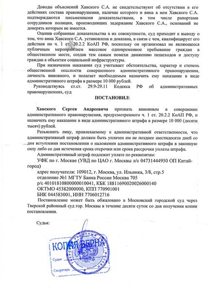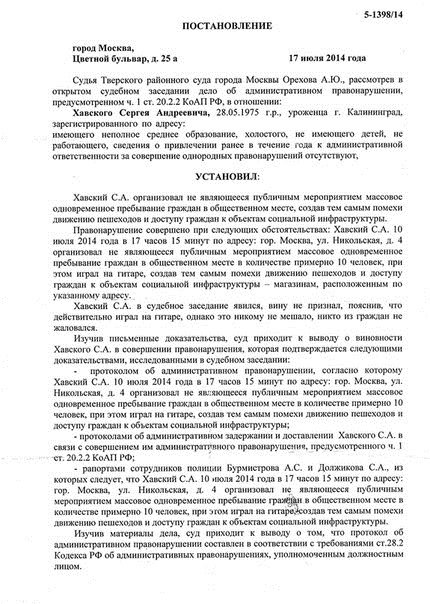 На днях Тверской районный суд Москвы в лице судьи Алеси Ореховой приговорил к штрафу в 10 тысяч рублей уличного музыканта. Сергей «Diamond» Хавский, игравший 10 июля на гитаре посреди улицы Никольской, был признан виновным по статье 20.2.2 — эта статья была введена в Кодекс об административных правонарушениях в июне 2012 года в рамках печально известного закона, ужесточавшего правила проведения массовых мероприятий. По этой статье привлекают за «организацию массового одновременного пребывания и (или) передвижения граждан в общественных местах, повлекших нарушение общественного порядка». Под эту формулировку может подпасть любое скопление людей, не являющееся митингом, пикетом, демонстрацией или шествием, — от «пробежек» и «оккупаев», организованных оппозиционными активистами, до каких-нибудь экзотических празднований, которые почему-либо покажутся полиции подозрительными. Музыканта осудили за то, что, организовав это самое массовое пребывание, он создал помехи движению пешеходов и доступу граждан к близлежащим магазинам. ОВД-Инфо публикует рассказ Сергея Хавского, который утверждает, что не только никакого «массового пребывания» рядом с ним не было, но он сам даже не находился возле того дома, который упомянут в судебном постановлении.
