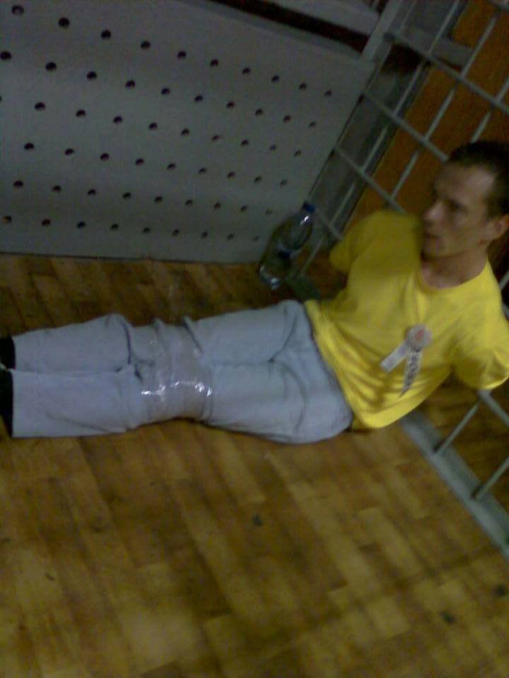 Я сидел на полу в пыточных условиях наподобие полу-дыбы в клетке обезьянника. Я понимал, что скорую вызвали наши, чтобы как-то открыть беспредел полицаев и тем самым помочь мне избавиться от этих пыток. И вот приходят эти две сотрудницы «Скорой», видят меня сидящего на полу со связанными скотчем ногами, с закрученными за спиной, сцепленными наручниками и замотанными скотчем руками, приподнятыми за спиной так, что плечи выворачивает. С меня еще не перестал пот течь — от боли и от того, что совсем недавно эти архаровцы-полицаи (в основном те, кто производили незаконные задержания и оформление лже-протоколов на незаконно-задержанных), под предводительством местного дежурного полицая в синей рубашке, толпой меня крутили и вязали, а мне приходилось сопротивляться этой фашистской экзекуции. Кстати, после того как меня скрутили, один из самых молодых полицаев-фашистов, из тех, что незаконно грубо хватали людей, пришедших почтить память жертв и погибших на войне в Украине у украинского посольства, с издевочкой положил рядом со мной закрытую бутылку воды, улыбаясь, и произнеся следующие слова: «На, если вдруг попить захочешь. Мы же не звери какие». А другой из них, уходя, также издевательски с усмешкой пожелал мне: «Удачи…»