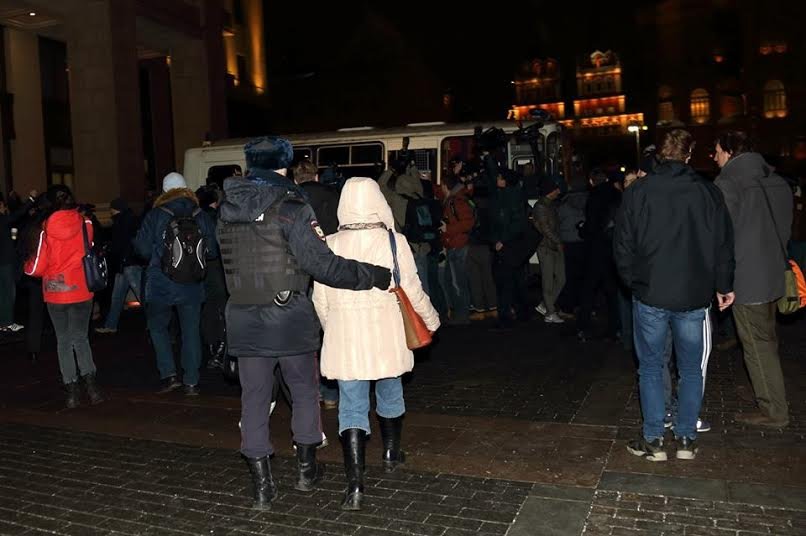 30.12.2014 На Тверской после приговора Навальным. Стояли, ОМОН грубо утащил, в автозаке 22 человека, ОВД «Войковский». Хотели нас фотографировать и взять отпечатки пальцев, я позвонила в ОВД-Инфо, проконсультировалась, и мы отказались. На вопрос «Зачем?» отвечают: «А чтобы в другой раз не надо было это делать» К нам приехал адвокат Сергей Александрович Миненков, спасибо ему большое! Очень помог. Оформили и отпустили без протокола.