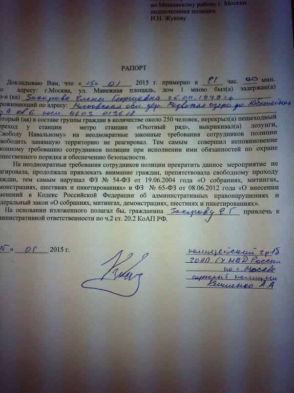 Полицейский, который задерживал меня, дождался и написал протокол задержания, где переврал время и всё остальное, я не сопротивлялась и не вспоминала Навального.