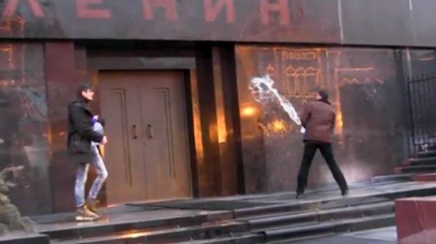 19 января участники арт-движения «Синий всадник» Олег Басов и Евгений Авилов провели на Красной площади перформанс под названием «Изгоняющие дьявола. Осквернение Мавзолея». Сотрудники полиции задержали двух активистов, которые со словами «Встань и уйди» стали поливать Мавзолей Ленина освященной водой из пятилитровых бутылок.