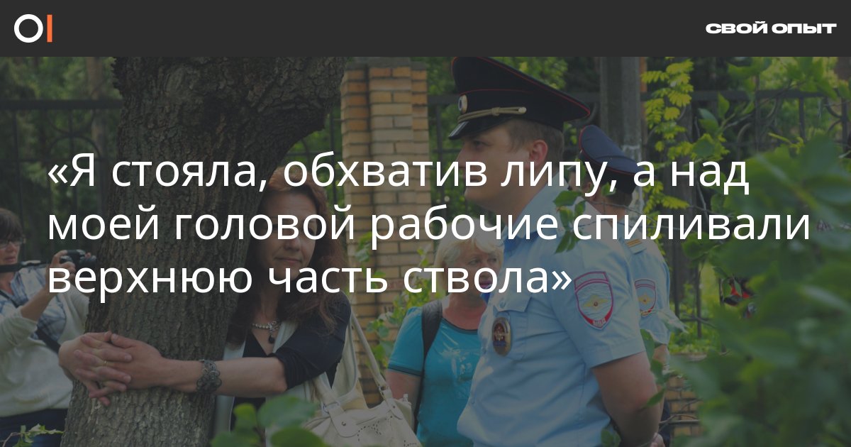 В тот день я на велосипеде ехала на обеденный перерыв домой, когда мне начали звонить мои соседи и сообщать о начавшейся вырубке. Подъехав на место, я увидела, что там уже собралось достаточно много жителей, которые остановили начавшиеся работы и вызвали полицию. Я тоже позвонила в полицию. Как и другие жители, я считала, что незаконность проводимых работ под линиями высоковольтных сетей без разрешительной документации настолько очевидна, что сотрудники полиции немедленно остановят незаконные работы и задержат нарушителей. А вместо этого задержанной оказалась я и еще один житель близлежащего дома. И опять ситуация повторилась, как и на ул. Нижегородской. Вместо того, чтобы остановить незаконную вырубку — полиция ее охраняла. Да, как и остальные жители, вместе с депутатом Безлепкиной С.Н., я пыталась остановить незаконные работы. Я стояла, обхватив руками широкий ствол липы, а в это время над моей головой, нисколько не остановленные моим присутствием, рабочие с подъемника спиливали верхнюю часть ствола. Примечательно, что полиция просила меня покинуть территорию, но она не требовала остановить работы по спиливанию деревьев, которые в тот момент представляли угрозу для моей жизни (и их жизни, кстати, тоже). Так мы и стояли какое-то время: я, обнимающая содрогающийся от спиливания ствол, а напротив полиция, прекрасно осознающая беззаконие, совершаемое у них на глазах, и то же время, охраняя его. Дальнейшая ситуация развивалась предсказуемо для нашего города. Меня потащили в машину и доставили в участок, где на меня был составлен протокол по ст.19.3 КоАП (неповиновение законным требованиям полиции). Дальнейшую вырубку я уже не видела, но очевидцы рассказывали, что во время проведения работ неоднократно создавались ситуации угрозы падения высоких деревьев на необесточенные провода.