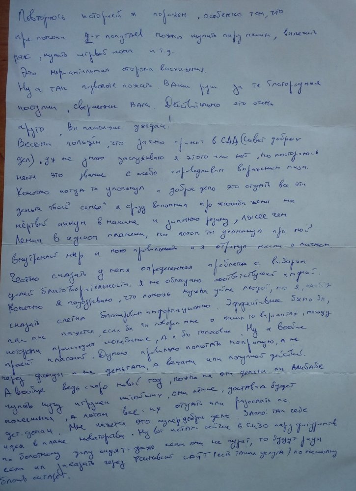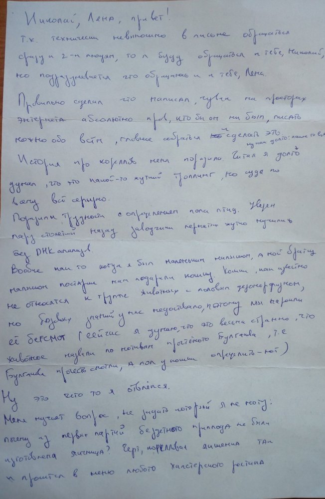 В результате завязалась отличная переписка, фрагмент которой опубликован ниже. Пишите узникам и вы: на самом деле, это не так сложно, а в тюрьме очень помогает.