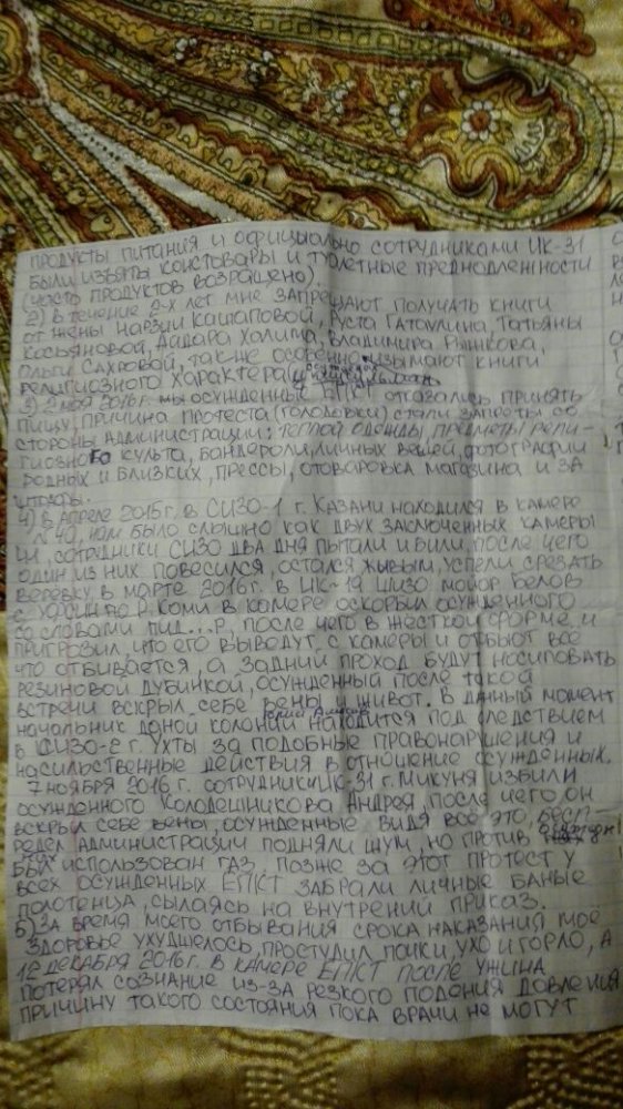 2) В течение 2-х лет мне запрещают получать книги от жены Нарзии Кашаповой, Руста Гатаулина, Татьяны Касьяновой, Айдара Халима, Владимира Рыжкова, Ольги Сахровой (так в тексте — ОВД-Инфо), также особенно у осужденных мусульман изымают книги религиозного характера.