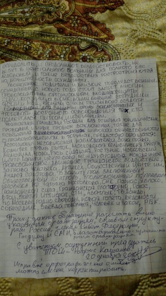 Уважаемые граждане России! Для решения юридических, правовых и иных проблем заключенных, а также для сообщения широкой общественности о правонарушениях в тюрьмах предлагаю обращаться: Ассоциация независимых наблюдателей, Зона права, Комитет против пыток, Московская Хельсинкская группа, Мемориал, Агора, Русь сидящая, Росузник, Московский Центр Карнеги, Центр «Сова», Международное молодежное правозащитное движение, Гражданское содействие, За права человека, Артикел, Общественный центр им. Андрея Сахарова, «В защиту прав заключенных», Общественный контроль, Уполномоченный по правам человека РФ Татьяна Москалькова, ОНК, Парнас, Яблоко, Гражданская сила, Гражданская платформа, Голос, ВТОЦ, партия Иттифак, СТМ «Азатлык», ТВ Дождь, Эхо Москвы, Радио Свободы, Новая газета, Ведомости, Собеседник, Звезда Поволжья, Человек и закон, РБК.