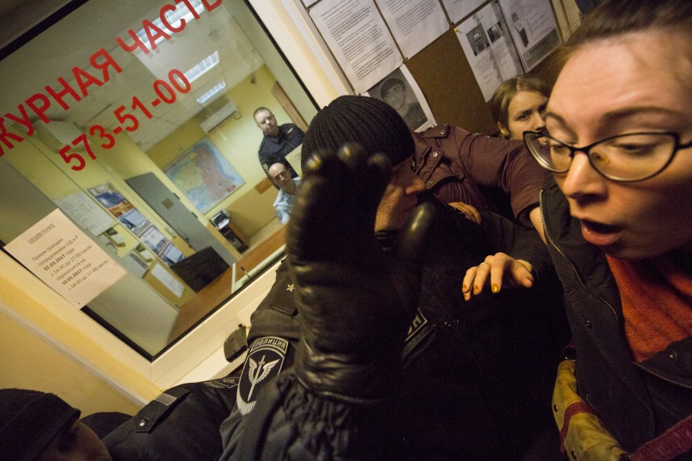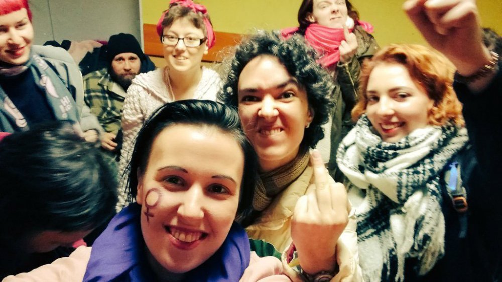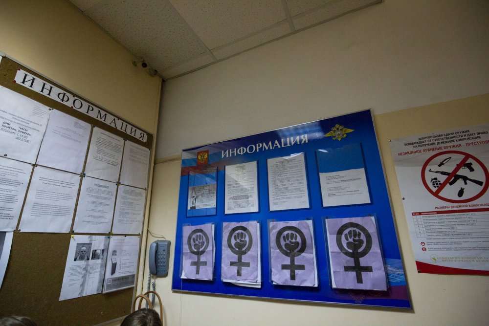 Я очень давно, в принципе, не задерживалась, лет восемь. И могу сказать, что произошли просто гигантские перемены, в первую очередь благодаря техническому прогрессу. Все сразу достали свои планшеты, айфоны, начали вести прямую трансляцию, делать селфи из отдела. Потом начали смотреть, чем закончилась демонстрация, чем закончилось всё это гуляние, что происходит на Дворцовой. Кто-то говорит: «…Вот, я так мечтала в это восьмое марта, спустя сто лет — мы на Дворцовой! Акция закончилась, и вот была бы у меня фотография, что я с людьми, с феминистскими лозунгами на Дворцовой. Так жаль, что не получилось, но круто выглядит со стороны». Ну и, конечно, что ты не чувствуешь паники такой, что тебя оторвали от некого коллективного действия и изолировали. То есть ты полностью включен в процесс. Мы потом стали смотреть прямые трансляции, что происходит снаружи у отдела. Туда тоже подошло человек 20–30, которые там пели песни, пытались войти в отдел.