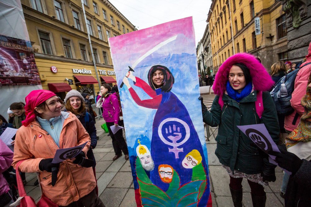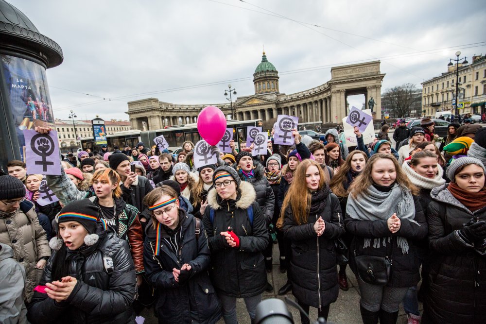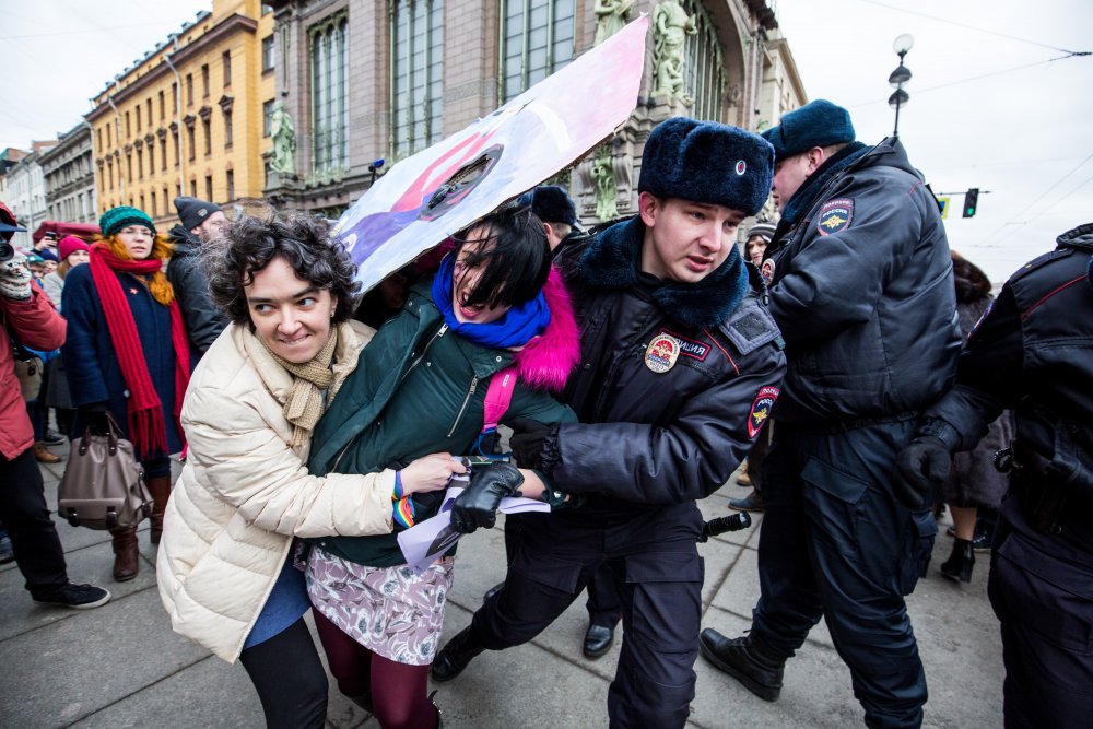 Восьмого марта, в Международный женский день, по всему миру проходят различные мероприятия, посвященные защите прав женщин. В Петербурге во время акции «Феминизм — для каждой» на Малой Садовой и Малой Конюшенной улице было задержано 14 человек. Из них один был оставлен на ночь в отделе полиции. ОВД-инфо публикует рассказы четырех задержанных девушек и анархистки из группы поддержки.