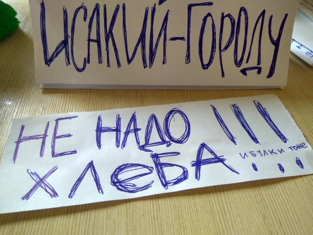 Полицейский проходит мимо нашей кормушки, видит на нем кота, забирает и уносит, оставляя слово «Не положено». Составляю объявление о пропаже кота. Описываю: 5–6 см, кот из хлеба, верните за вознаграждение — творожную булочку. Для того, чтобы обратили внимание, забиваю всю кормушку батонами, которые нам давали тут и передавали в передачках. Приходит полицейский и прокурор. Рассказываем, что чувствуем себя хорошо. Больше ничего от нас им и не нужно.
