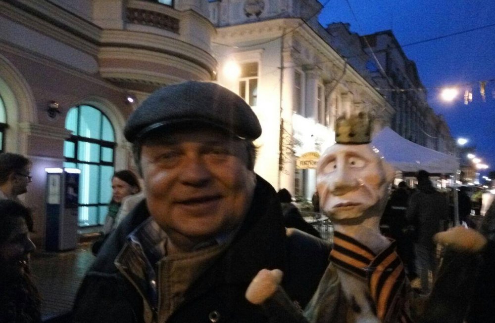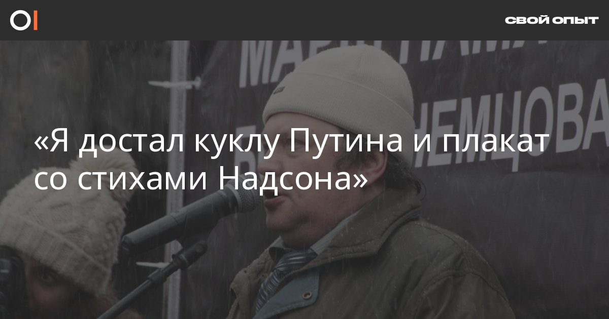 Там было довольно много народа, часть из них водила хоровод. Музыка все заглушала, говорить можно было, только крича в ухо собеседника. Я достал куклу Путина и плакат со стихами Надсона о «стране без прав и без закона». Минут 15 у меня ушло на осознание того, что все присутствующие вообще — наши сторонники, что кроме них и ментов на площади вообще никого нет. Моя жена говорит, что тоже не сразу это поняла. Я видел пустую сцену с колонками, откуда ревела музыка. Разведка сообщила, что у сцены 4 охранника, и не составит труда ее занять, отключить музыку и начать митинг. Я попросил передать по рядам — идем к сцене. Минуты через две-три хоровод переформатировался, и люди направились в сторону сцены… однако прошли мимо нее по Рождественской в сторону моста. И тут я понял, что моя информация не достигла цели, люди организовались сами. Но началось скандирование «Путин-вор» и т. п., это было круто, музыка уже не заглушала нас. У блокопоста народ развернулся и пошел назад, опять мимо сцены и…зачем-то вернулся к месту хоровода, в центр загона, где продолжала орать музыка. Тогда я попытался развернуть колонну, встал впереди и сказал, что мы идем гулять к Минину и Пожарскому. После чего на меня набросились менты. Стоявшие рядом попытались построить сцепку, но безуспешно. Меня пытались не отдать ментам жена, дочка; сцепку попытались организовать Илья Мясковский, Дмитрий Калинычев и Владимир Кравцов, и, кажется, еще несколько человек — трое последних в итоге оказались в автозаке вместе со мной.