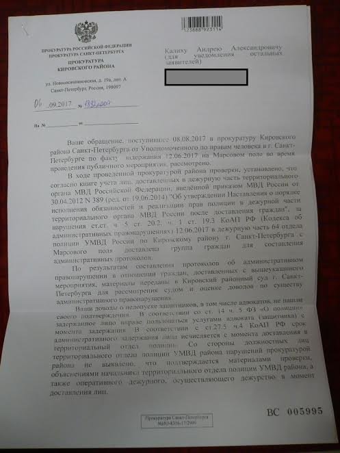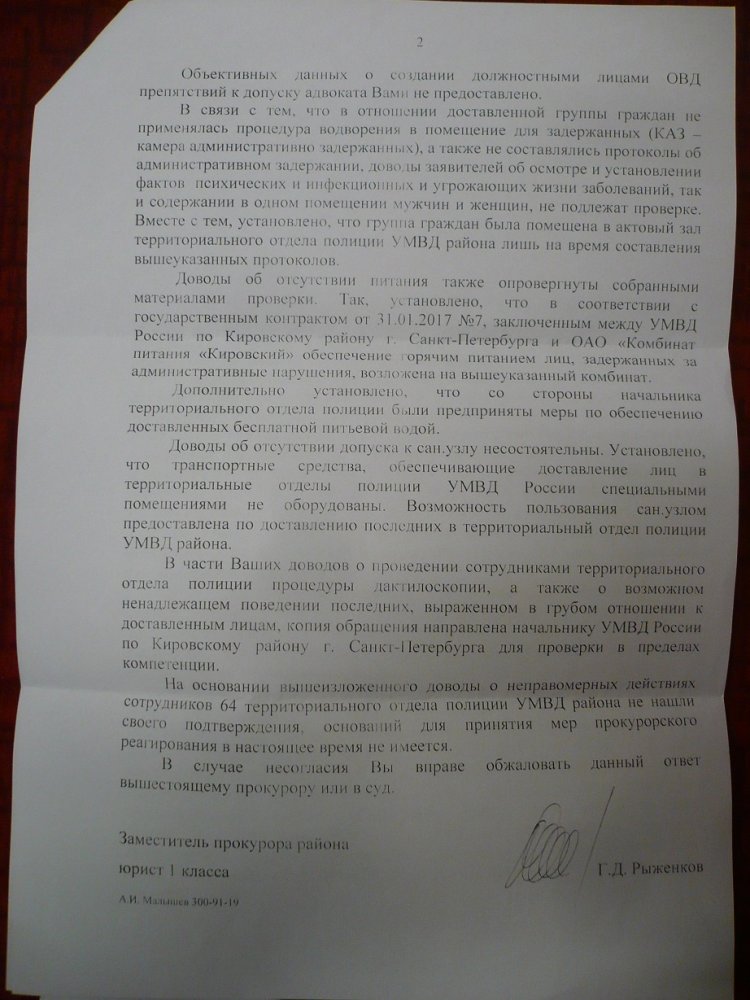 На жалобы об условиях содержания Кировская районная прокуратура ответила мне, что… мы все врем. Если кратко. Например, на нашу претензию, что не был допущен адвокат, они пишут: а где доказательства, что он приходил? Наша жалоба на условия содержания в ОП 64 отражена в решении городского суда Санкт-Петербурга, но была, конечно, проигнорирована. Потом подали в ЕСПЧ, там условия содержания в ОП 64 описаны подробно.