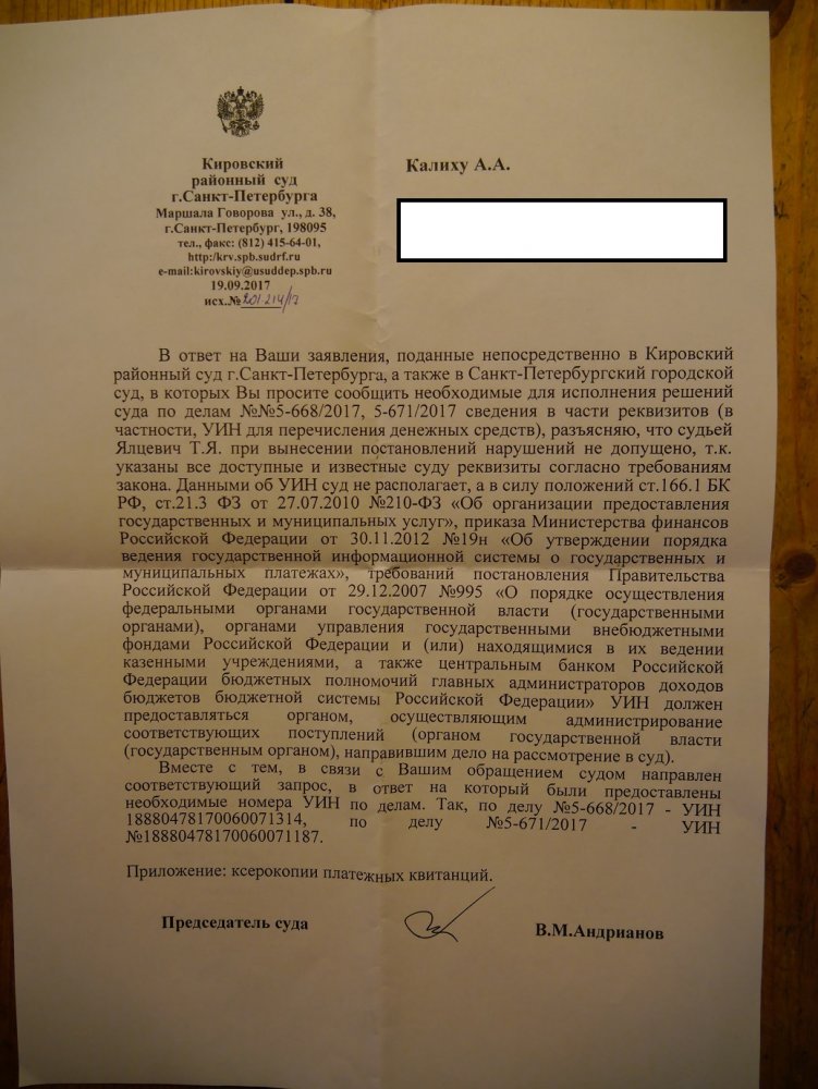 Я посоветовался со своим юристом, и мы решили составить еще одну жалобу. Я пошел в «Сбербанк», попытался заплатить, естественно, ничего не вышло. Попросил официальную бумагу об отказе принять квитанцию о штрафе. В «Сбербанке» долго созванивались, сказали, нужно писать заявление, ответ на него может 15 дней идти. Но ответ мне пришел тут же. На основании этой бумаги я написал жалобу в прокуратуру Кировского района с копиями в Кировский районный суд и в городской суд Санкт-Петербурга. Мне пришел ответ только из Кировского районного суда, но зато испуганный: это не мы ответственные, а полиция, но мы выяснили для вас ваши УИНы и их вам сообщаем.
