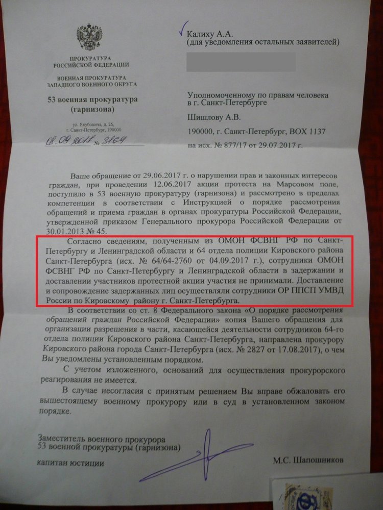 От Москальковой я получил отписку, что обращение рассматривается — больше до сих пор ничего нет. От Шишлова пришла тоже отписка, но интересная: что нашу жалобу почему-то переслали в военную прокуратуру такого-то гарнизона Санкт-Петербурга. По мнению Шишлова, нас задерживал ОМОН Национальной гвардии, который относится к Министерству обороны. По существу аппарат петербургского уполномоченного мне ничего не ответил. Через месяц приходит ответ из военной прокуратуры — конечно, не мне, а Шишлову, с копией мне. Мы разобрались, мы тут ни при чем, вас брал «простой ОМОН» — пишет военная прокуратура.