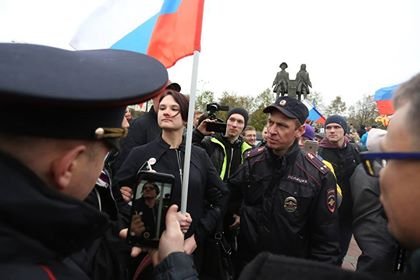 На Площадь Труда я, координатор штаба Виктор Бармин и еще человек десять пришли вместе, однако пробыли там от силы минут пять. К Бармину подошли представители МОБ и полиции с требованием «прекратить мероприятие», на что мы, естественно, ответили отказом. Мне велели убрать плакат. После пары минут препираний попросту забрали его и повели под ручку в штабной автобус. Я была первой задержанной в Екатеринбурге, даже координатор штаба вошел в автобус уже после меня. Отмечу, что я несла также флаг России — к нему претензий не было, что радует.
