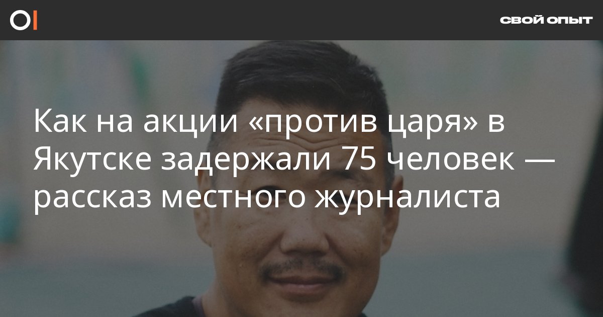 ОВД-Инфо публикует рассказ Ое Карпова, журналиста из Якутии, о несогласованной акции в Якутске 5 мая 2018 года. На ней задержали 75 человек. Большинство из них отпустили, но на пятерых все же составили протоколы по разным административным статьям.