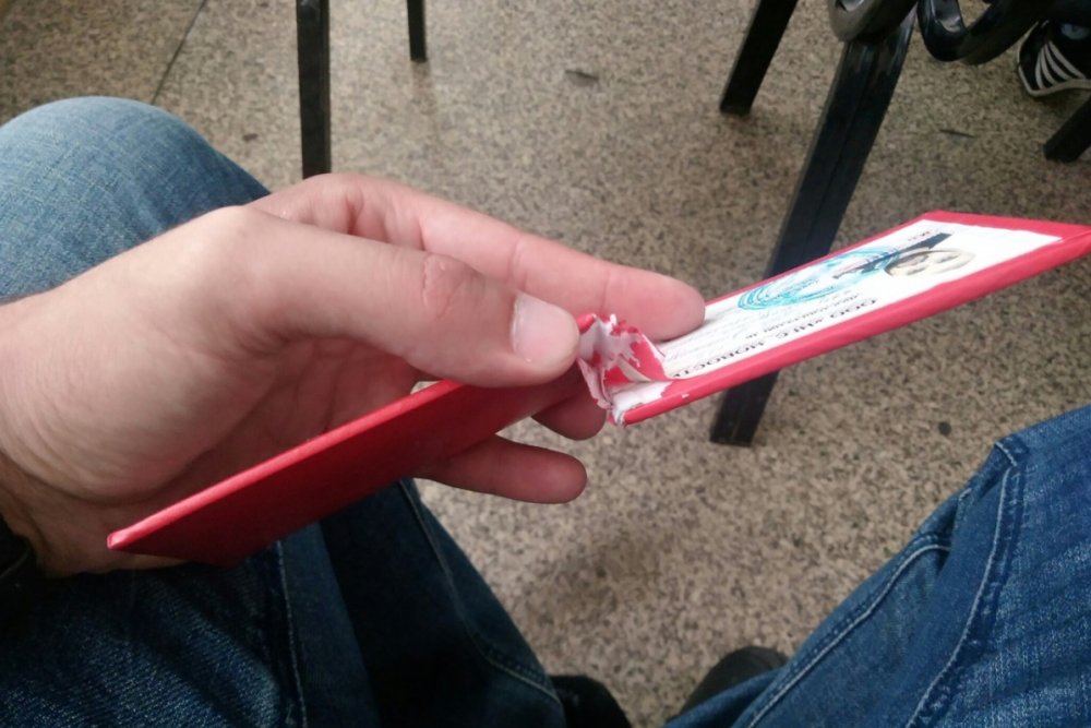 Понятыми пригласили молодого человека, который потерял паспорт, и еще какого-то мужчину. Удостоверение изъяли, подробно описали его, в том числе то, что оно имеет повреждения. Запечатали его, выдали копию протокола об изъятии, попрощались и отпустили.