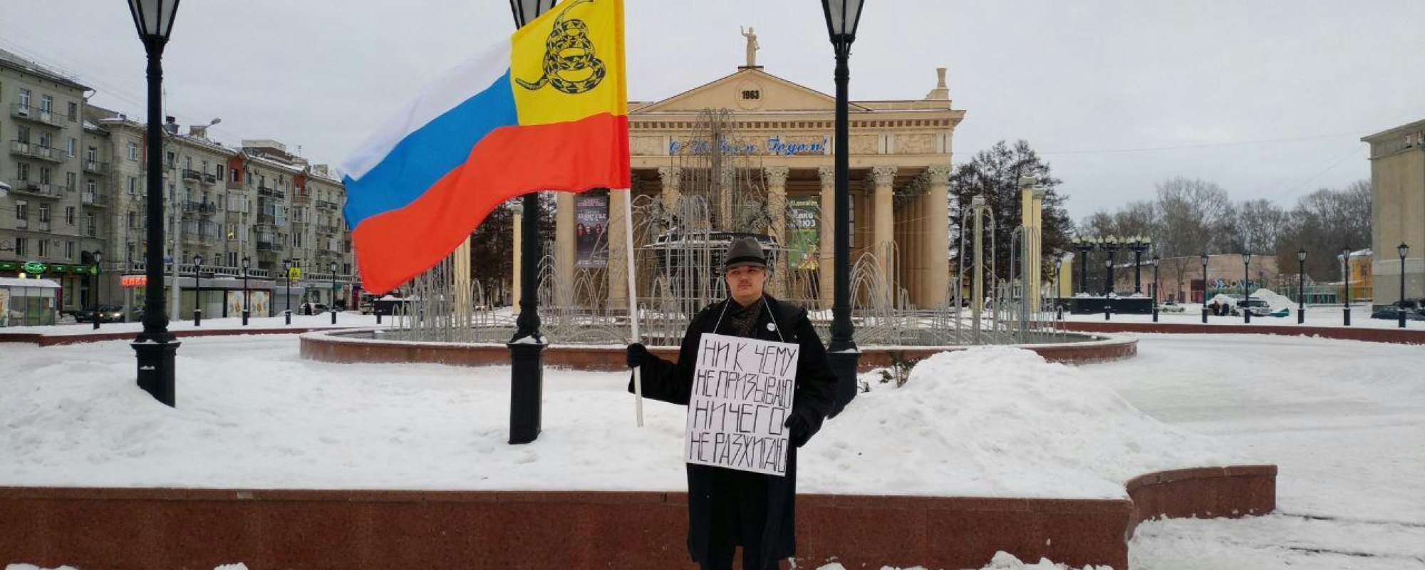Я приобрел себе такой флаг. Сначала я вышел с ним в одиночный пикет. На пикете было около десяти сотрудников полиции, когда переговаривались по рации, у них такая фраза прозвучала: «Он стоит с российским флагом, но со змейкой». На этом все вроде обошлось. Они пофотографировали, как обычно, мой одиночный пикет, и поехали по своим делам.
