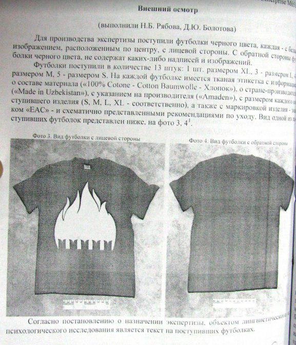 Они даже футболки исследовали как текст. Единственная буква на наших футболках — это название размера. Что они исследовали? В материалах экспертизы есть такой вывод: футболки нескольких размеров, значит содержащаяся на них информация может быть распространена среди широкого круга лиц. Я очень жду, что в следующий раз мои татуировки подвергнут экспертизе и скажут, что вот изображено на запястье лезвие «Спутник», значит призываю кого-нибудь к суициду.