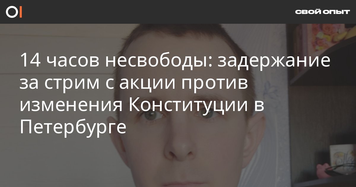 В Петербурге 15 февраля должна была пройти серия одиночных пикетов против изменения Конституции. Участников почти сразу начали задерживать. В отделы полиции увезли 16 человек, некоторых не отпускали больше 12 часов. Мундеп города Пушкин Сергей Лазарев провел в автозаках и отделе больше 14 часов. Его задержали после того, как он объяснял полицейским, что одиночные пикеты не требуют согласования. ОВД-Инфо записал рассказ Лазарева.