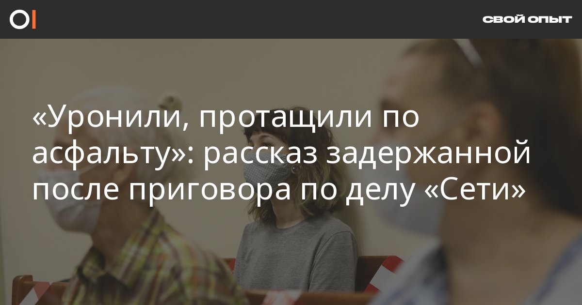 22 июня в Петербурге приговорили фигурантов дела «Сети». Виктора Филинкова — к семи годам, Юлиана Бояршинова — к пяти с половиной. После оглашения приговора у суда задержали 30 человек. Одной из первых — Яну Сахипову, жену Бояршинова. Следующие два дня она провела вместе с задержанными в отделе полиции. К ним долго не пускали защитников, вынудили спать на полу, а во второй день полицейский толкнул Сахипову на пол и закрыл в камере.