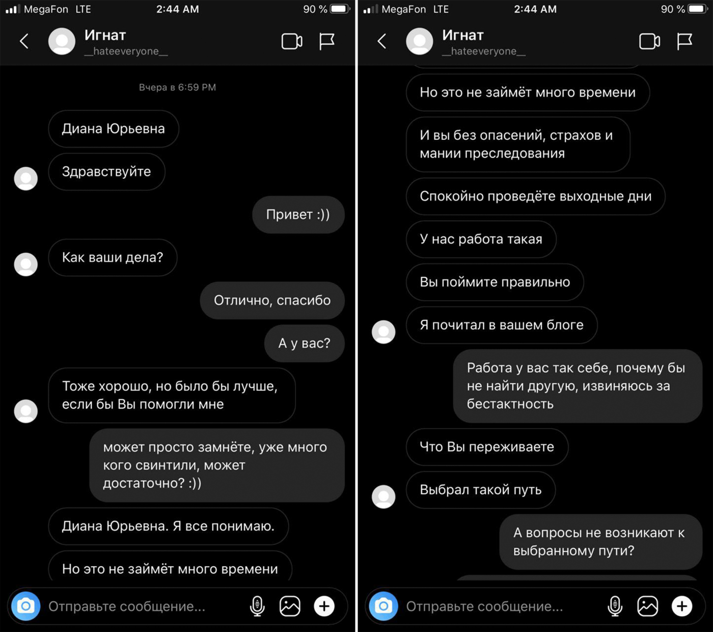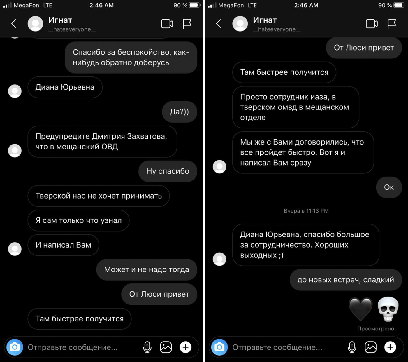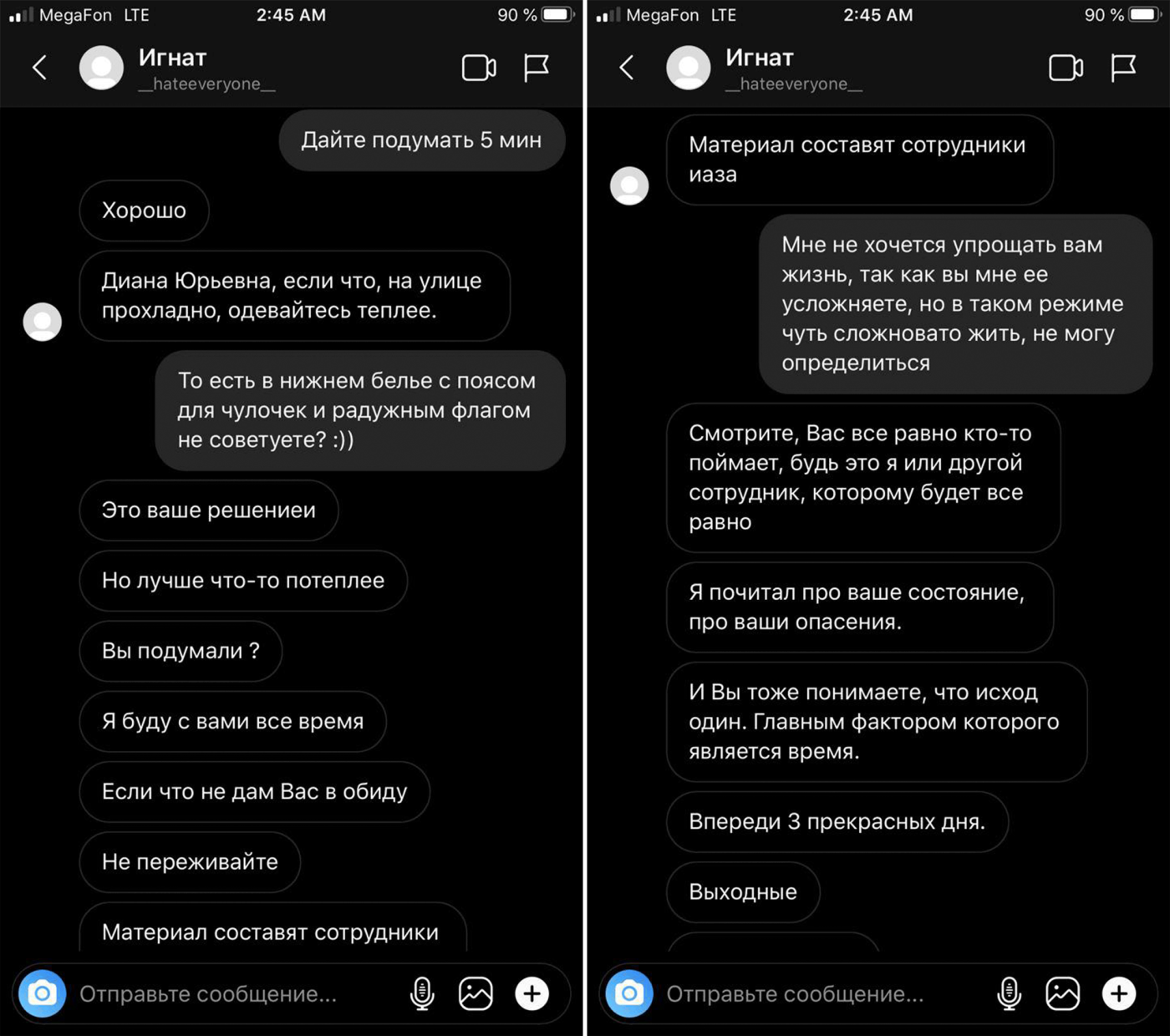 В четверг пришел оперуполномоченный, тактично стучал, не ломился, и долго и супервежливо просил меня выйти. Потом он написал мне в инстаграм. Обычно я не отвечаю на такие сообщения, но тут я вижу, что пишут «Диана Юрьевна». А он под дверью обращался ко мне на «вы» и тоже «Диана Юрьевна». Мне сразу стало понятно, что это оперуполномоченный. Стало любопытно и забавно, и я решила ответить. И вот это, как мне кажется, была ошибка.