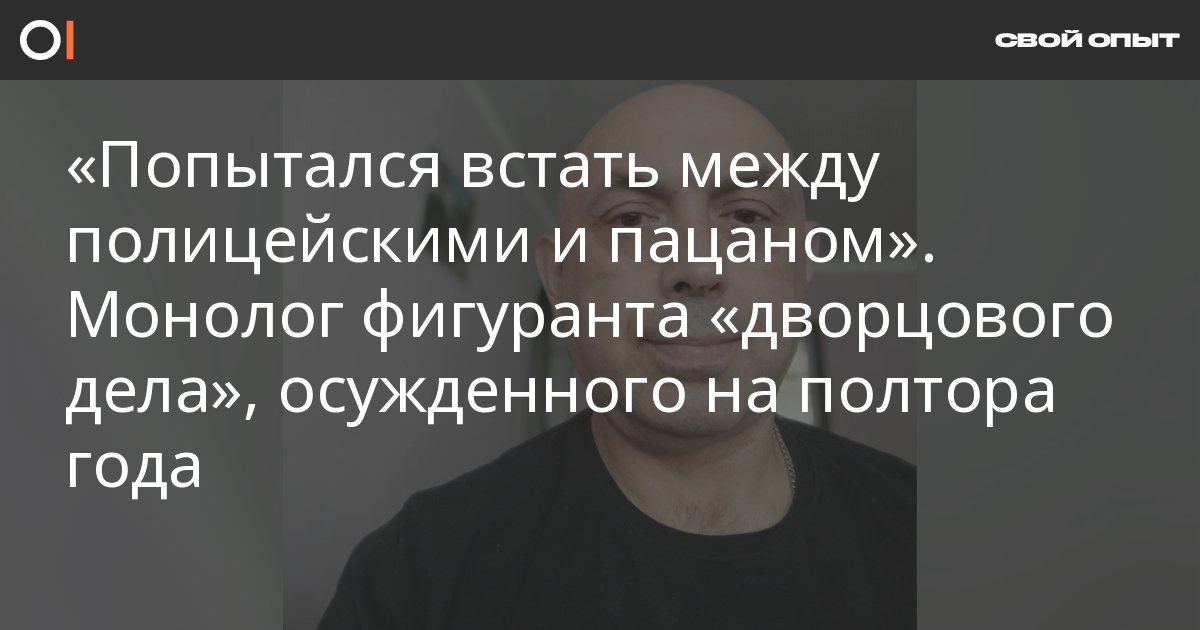 Зимой в разных городах России прошли протестные акции, катализатором которых стало расследование ФБК «Дворец для Путина». Во Владимире во время митинга 23 января Валерий Лавров заступился за молодого человека, которого жестко задерживали полицейские. В итоге два дня он пробыл в ИВС без доступа к питьевой воде, а потом получил полтора года колонии-поселения за насилие в отношение представителя власти. Публикуем его монолог.