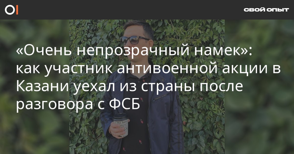 Одного из участников антивоенной акции в Казани, Кирилла Алехина, задержали 24 февраля с плакатом «Миру — мир» и арестовали на 10 суток. После этого к нему пришли с обыском в рамках уголовного дела о массовых беспорядках (ст. 212 УК), а еще через некоторое время вызвали в ФСБ, где объявили, что его подозревают в распространении «фейков» про российскую армию (ст. 207.3 УК). В итоге Кириллу пришлось покинуть Россию.