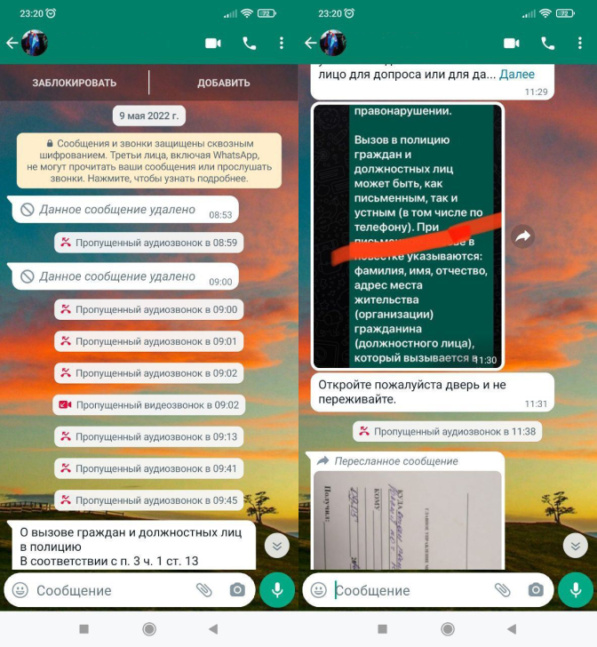 Я тут же позвонила в ОВД-Инфо, хотела проконсультироваться, что вообще в таких случаях нужно делать. Мне объяснили, что я имею право не перезванивать на незнакомый номер, и хотя человек продолжал мне писать, я перестала отвечать и подумала, что на этом история для меня закончится
