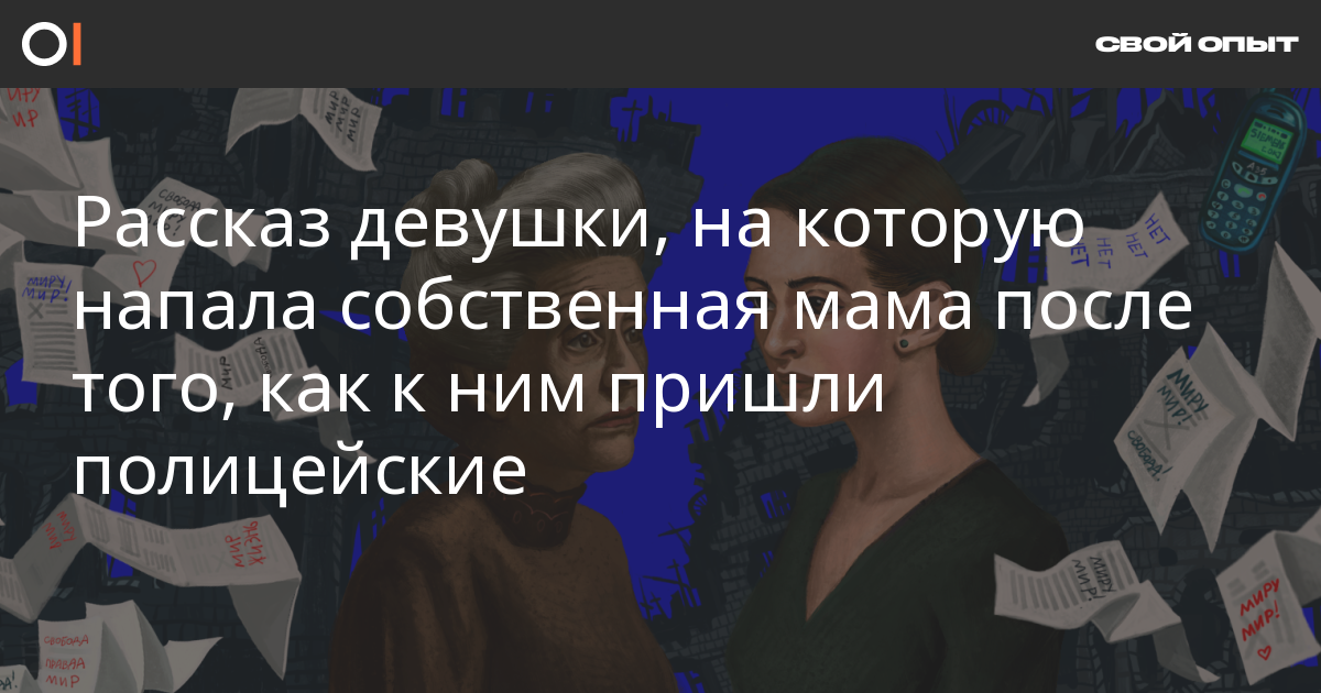 Несмотря на то что массовые антивоенные акции в России прекратились, людей продолжают задерживать за антивоенные высказывания. Жительницу Новосибирска Марию заподозрили в распространении постов с надписью «Миру мир». Сначала ей позвонил с незнакомого номера мужчина, представившийся участковым, а потом полицейские несколько часов ломились к ней в квартиру. Кроме того, у нее произошел конфликт с мамой — та пыталась выдать дочь полиции.