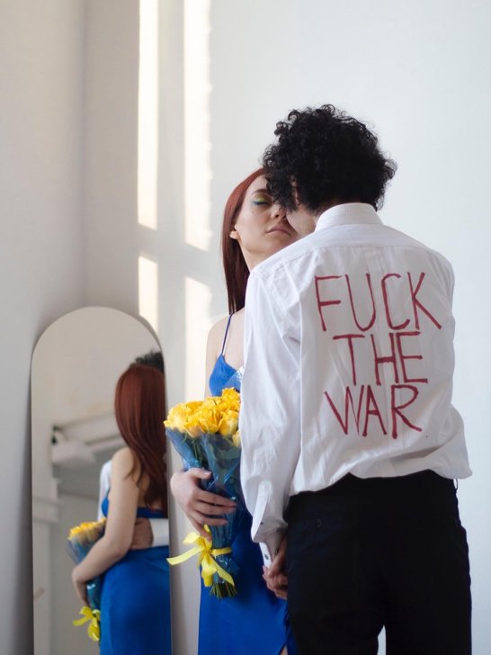 Свадьба у нас была назначена на 24 февраля. Так как Путин в этот же день развязал войну, я написал на рубашке «Fuck the war», а у Полины было синее платье и желтые цветы. Мы планировали расписаться и минимально отметить, празднование мы отменили. Но фотографии со свадьбы завирусились, особенно на западную аудиторию. Мы давали интервью Fox News, The Economist и другим медиа, говорили, что в России есть достаточно адекватных людей, выступающих против [войны], про протесты, про все эти тысячи задержаний.